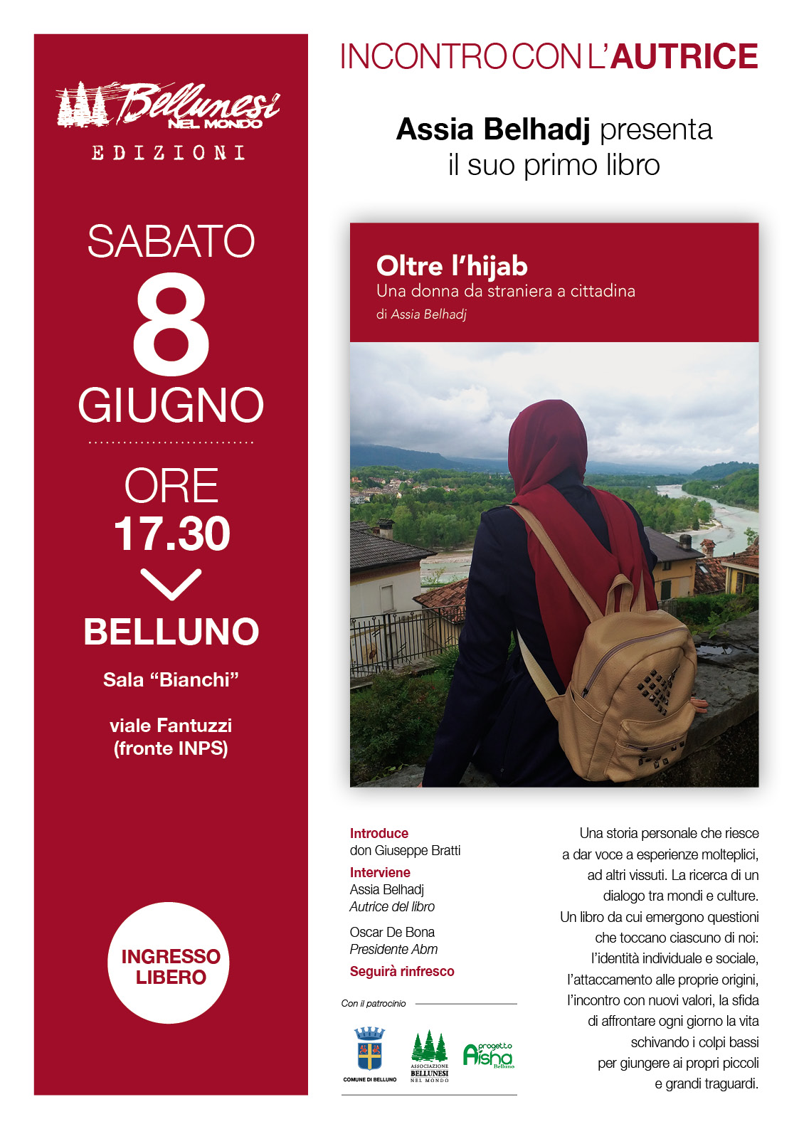“Oltre l’hijab. Una donna da straniera a cittadina”. Un libro per andare oltre i pregiudizi. Una storia personale che dà voce a esperienze molteplici, che parla di migrazioni, cittadinanza, cultura, integrazione e rapporto con il “diverso”. L’opera, della scrittrice italo-algerina Assia Belhadj ed edita dalla Bellunesi nel mondo edizioni, verrà presentata sabato 8 giugno in sala “Bianchi” a Belluno. Appuntamento alle 17.30. Sarà presente l’autrice. Introducono il professor Giuseppe Bratti e il presidente Abm Oscar De Bona. Ingresso libero. A conclusione verrà offerto un rinfresco. L’evento ha il patrocinio del Comune di Belluno ed è realizzato in collaborazione con “Progetto Aisha – Belluno”.