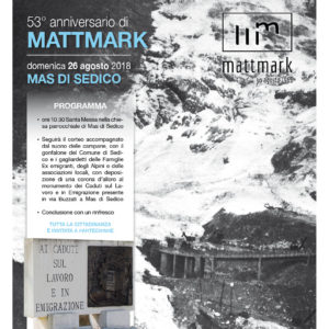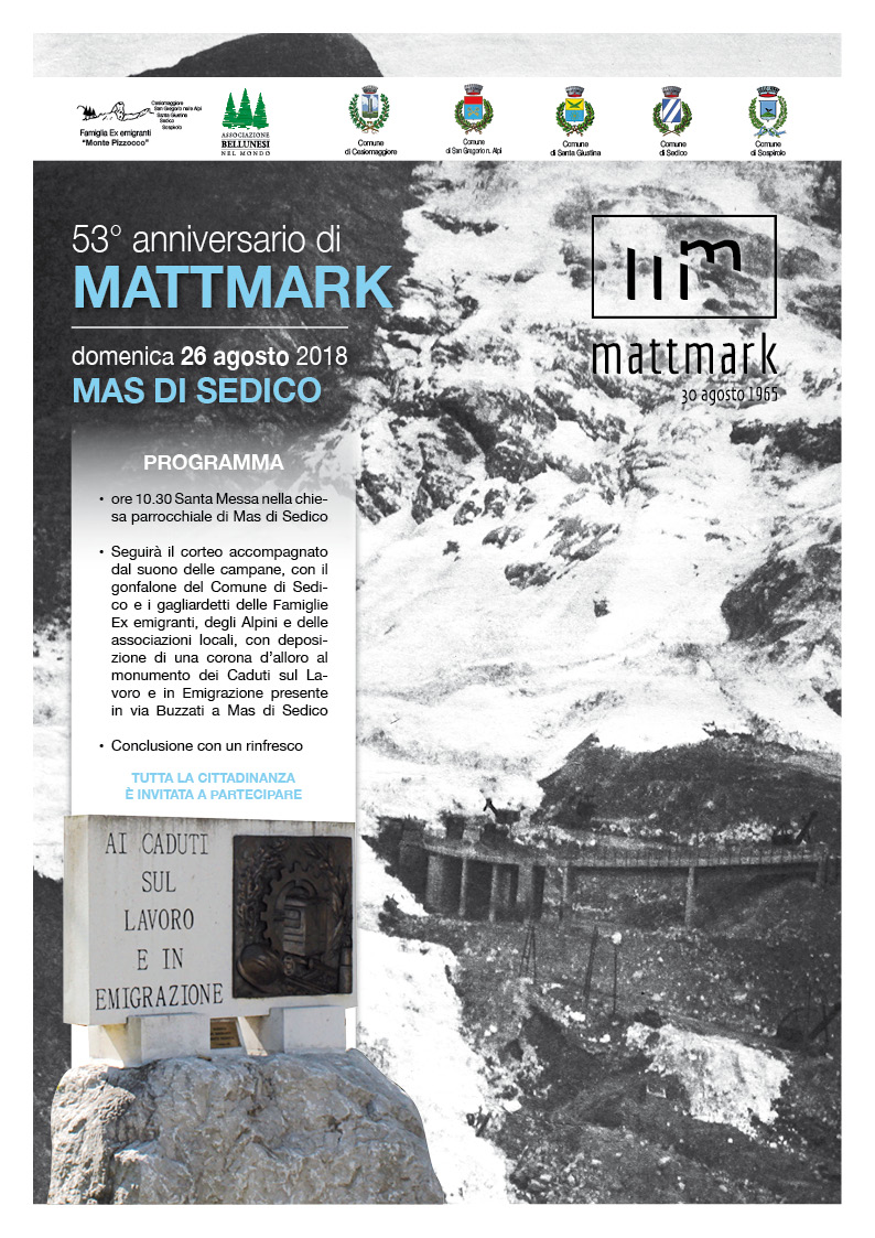 Quest’anno ricorrono 53 anni dalla terrificante catastrofe di Mattmark (Svizzera). 88 lavoratori, di cui 56 italiani – 17 bellunesi – morirono sotto l’implacabile massa di ghiaccio, roccia e fango in quell’infausta giornata del 30 agosto 1965. In pochi istanti si consumava un dramma che ha ferito profondamente la nostra terra e che è doveroso non dimenticare, tragico esempio delle sofferenze che hanno segnato la storia della nostra emigrazione. La Famiglia Ex emigranti “Monte Pizzocco”, con il patrocinio dell’Associazione Bellunesi nel Mondo e dei Comuni di Cesiomaggiore, San Gregorio nelle Alpi, Santa Giustina, Sedico e Sospirolo, organizza una semplice cerimonia, in ricordo di questa tragedia sul lavoro, nella giornata di domenica 26 agosto. Questo il programma: ore 10.30 Santa Messa nella chiesa parrocchiale di Mas di Sedico; seguirà il corteo accompagnato dal suono delle campane, con il gonfalone del Comune di Sedico e i gagliardetti delle Famiglie Ex emigranti, degli Alpini e delle associazioni locali con deposizione di una corona d’alloro al monumento dei Caduti sul Lavoro e in Emigrazione presente in via Buzzati a Mas di Sedico; conclusione con un rinfresco.