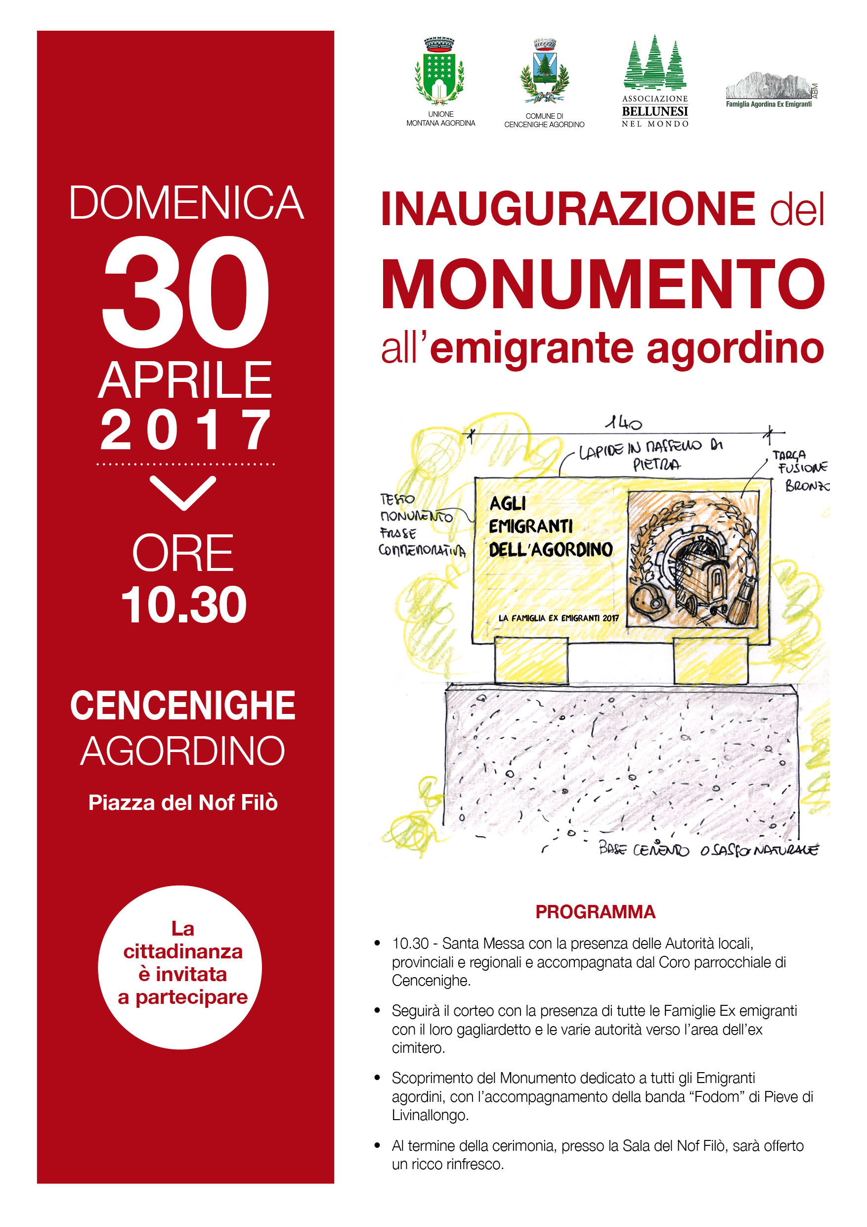 Il monumento, realizzato dalla ditta “Franco Fiabane”, sarà posizionato nella piazza del Nof Filò. Di seguito il programma della giornata: alle ore 10.30 Santa Messa con la presenza delle autorità locali, provinciali e regionali con l’accompagnamento del Coro parrocchiale di Cencenighe; seguirà il corteo con la presenza di tutte le Famiglie Ex emigranti con il loro gagliardetto e le varie autorità verso l’area dell’ex cimitero; scoprimento del Monumento dedicato a tutti gli Emigranti agordini, con l’accompagnamento della banda “Fodom” di Pieve di Livinallongo; al termine della cerimonia, presso la Sala del Nof Filò, sarà offerto un rinfresco.