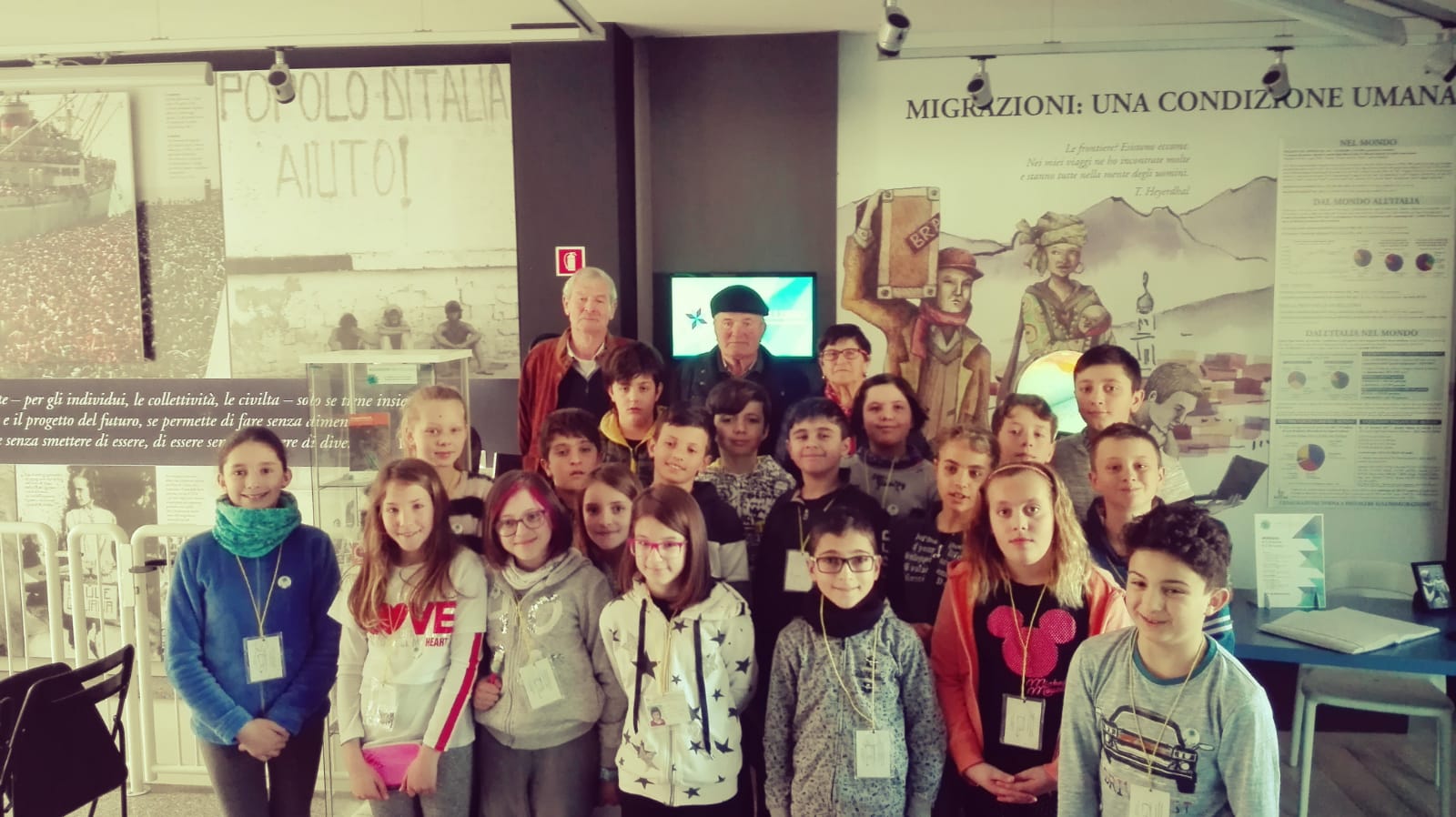 Nella giornata di oggi l’Associazione Bellunesi nel Mondo e una classe della scuola primaria di Pieve d’Alpago hanno ricevuto un’importante visita e una sorpresa molto speciale. Anzi, ben tre sorprese. Dopo la visita guidata al museo delle migrazioni, i ragazzi con le loro insegnanti hanno conosciuto il signor Camillo Moro e i coniugi Silvestro e Palmira Cortina. Per rendere ancora più reale il mondo delle migrazioni e tutto ciò che sta al suo interno, i nostri ospiti hanno raccontato la loro esperienza come migranti: testimonianze dirette che hanno coinvolto molto il gruppo di ragazzi interessatissimi a conoscere le loro vicissitudini. Grazie anche alla grande curiosità della classe, il signor Moro ha raccontato della sua esperienza in Germania, nella Foresta Nera, come boscaiolo dove all’inizio negli anni ’60 a soli 20 anni ha deciso di andare per lavoro. Anche il signor Cortina è emigrato all’estero: in Sudan sei anni come lavoro stagionale e poi in Turchia. La moglie, Palmira ha una storia differente, ma ugualmente importante. Nonostante non sia stata lei ad emigrare, la lontananza del marito si sentiva nella sua vita quotidiana con a carico animali, il campo e sei bambini. Due visioni diverse, ma interessanti: la storia di chi è partito e dei famigliari che qui in Italia sono rimasti, ma entrambe le parti con il pensiero sempre rivolto alla speranza di potersi rivedere presto.