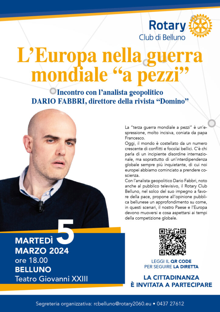 A questo e ad altri interrogativi, cercherà di rispondere l’analista geopolitico Dario Fabbri, noto anche al pubblico televisivo, in un incontro, promosso dal Rotary Club di Belluno martedì 5 alle ore 18 al Teatro Giovanni XXIII. Direttore della rivista “Domino” è la prima occasione in cui Fabbri partecipa a un dibattito pubblico in città. «L’Europa nella guerra mondiale “a pezzi”» è il titolo della relazione che gli è stata affidata.